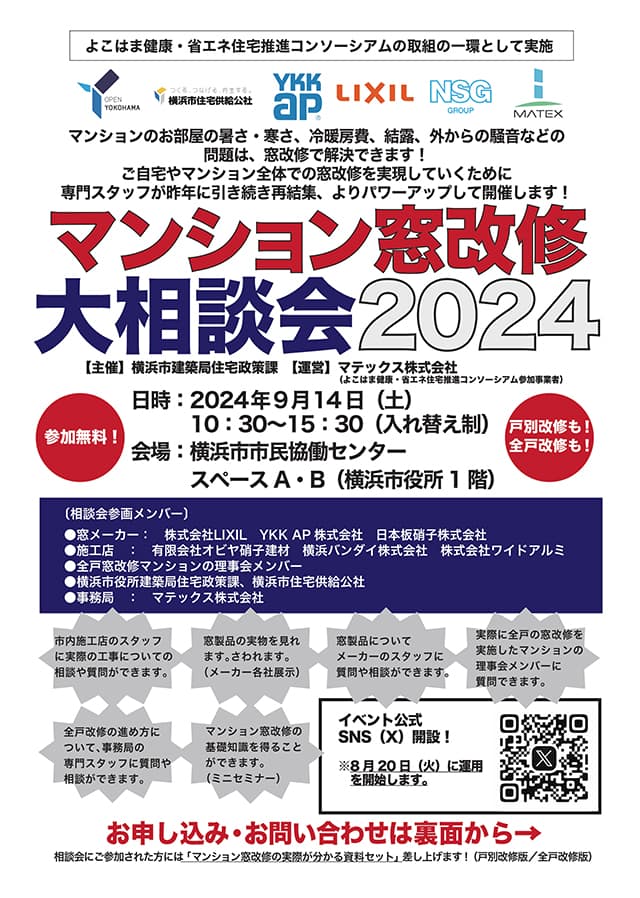 横浜市は9月14日、住宅省エネ性能等の向上へ向け、同市役所で「マンション窓改修大相談会2024」を開催する。23年2月に設立した「よこはま健康・省エネ住宅推進コンソーシアム」との共催事業。 対象は、マンシ(続く) -