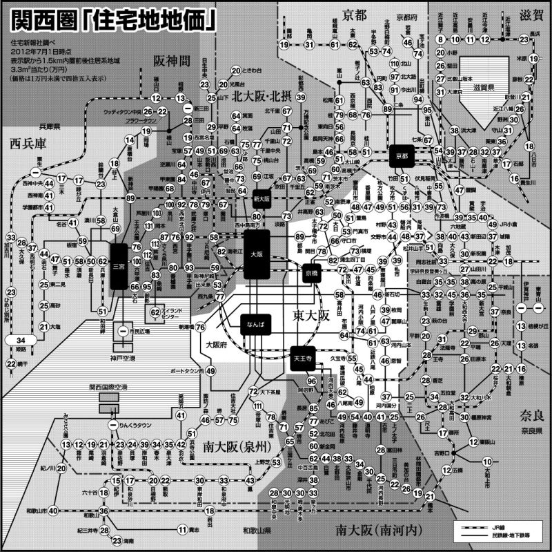 住宅新報 8月28日号 お気に入り住宅新報社大阪支社が行った関西圏(近畿2府3県、和歌山県北部、西部三重県の一部を含む)主要駅周辺の住宅地地価調査(7月1日時点)によると、調査対象全地点の平均価格は3.3m2(1坪)当たり47.1万円となり、前回調査(4(続く) -