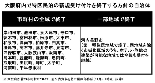 大阪府の特区民泊 29市町村が新規受付終了へ 地域制限含め4市は継続意向