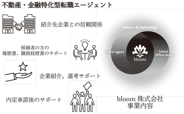 住宅新報 11月18日号 お気に入り単に、求職者と求人企業のマッチングではなく〝着実〟にステップアップできるキャリアデザインを支えている。優秀な人材を求める企業の成長にも寄与している。同社は現在、ハイクラス人材紹介事業『bloom talent(続く) -