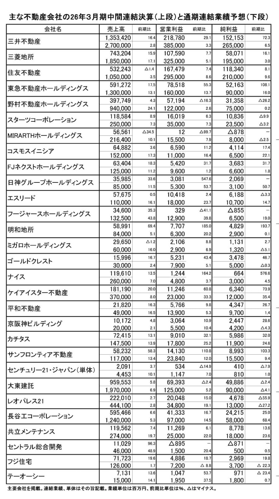 2026年3月期中間決算 大手各社 相次ぐ上方修正 高額分譲が利益貢献 都心オフィス増額改定9割以上