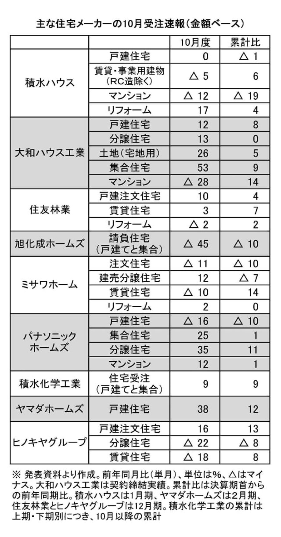 大手住宅メーカー10月受注金額 賃貸は2社が二桁成長 戸建て注文5社が前年プラス